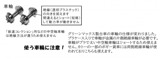 車輪は絶縁(透明プラスチック)の向きを揃えて取り付けます。「鉄道コレクション」用などの中空軸車輪は絶縁方法が違うため使えません。
